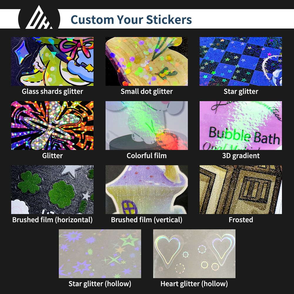 We offer a variety of lamination processes such as glass flakes, starburst, 3D gradient, brushed texture and frosted texture, giving your stickers a unique optical layer and tactile experience, allowing each design to show exciting visual depth and delicate texture.